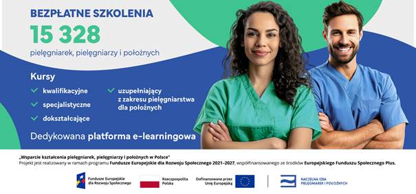 📚 Kurs realizowany jest w ramach projektu „Wsparcie kształcenia pielęgniarek, pielęgniarzy i położnych w Polsce”, współfinansowanego ze środków Europejskiego Funduszu Społecznego Plus, w programie Fundusze Europejskie dla Rozwoju Społecznego 2021–2027.