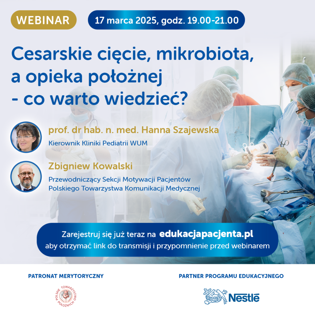 Serdecznie zapraszamy do udziału w webinarze! Badania dowodzą, że we wczesnym okresie życia niemowlęta urodzone przez cesarskie cięcie mają inny zestaw bakterii jelitowych niż dzieci urodzone silami natury. Zamiast pobierać drobnoustroje od swoich matek, nabywają bakterie ze środowiska szpitalnego. Te zmiany potencjalnie wiążą się z długoterminowymi konsekwencjami zdrowotnymi, takimi jak zaburzenia odpornościowe i alergie. Czy i jak sposób porodu wpływa na przyszłe życie odpowie prof. dr hab. Hanna Szajewska. Zapisz się już dziś!