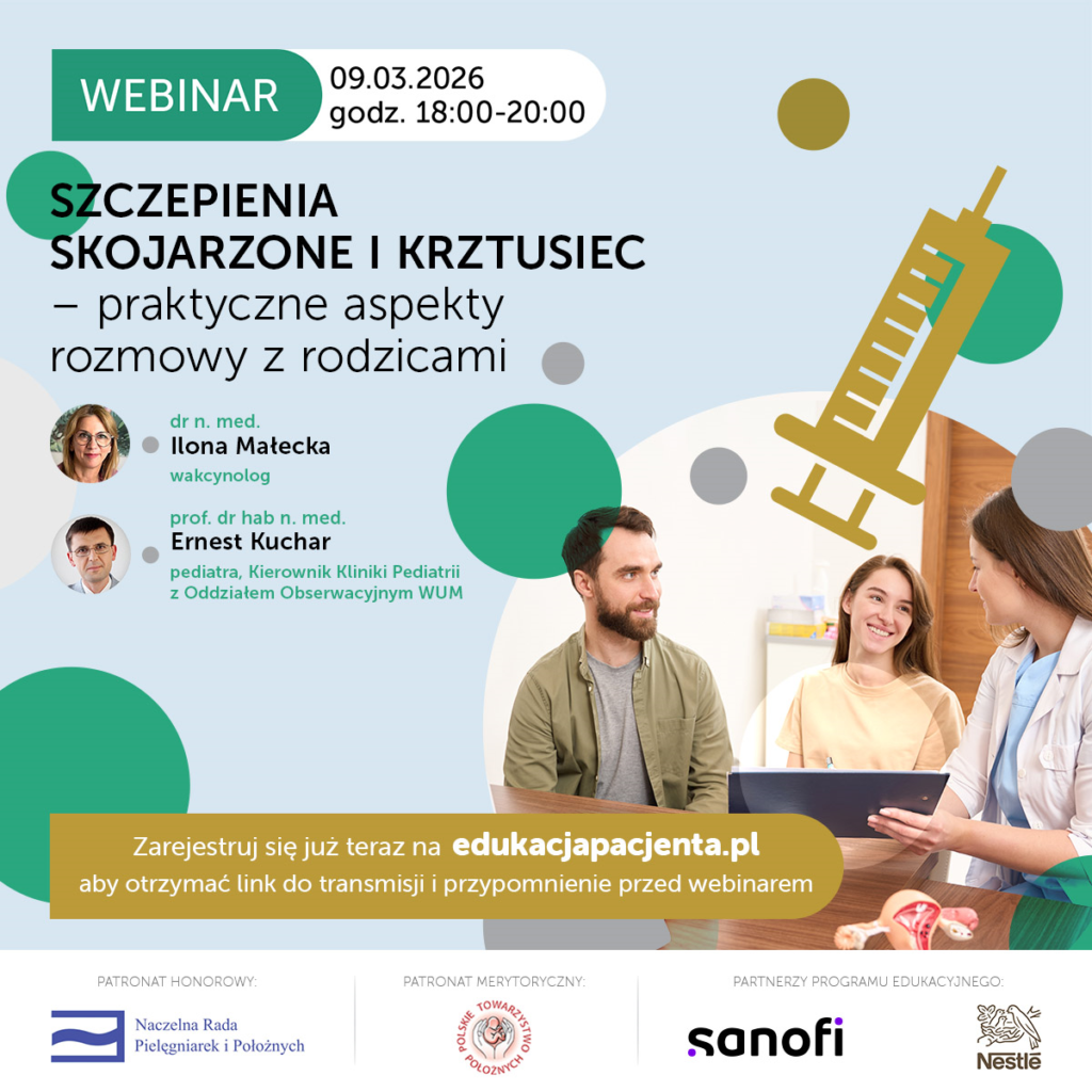 Patronat honorowy nad wydarzeniem objęła Naczelna Rada Pielęgniarek i Położnych, patronat merytoryczny Polskiego Towarzystwa Położnych. W webinarze wezmą udział dr n. med. Ilona Małecka oraz prof. dr hab. n. med. Ernest Kuchar